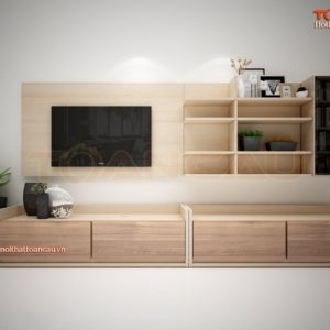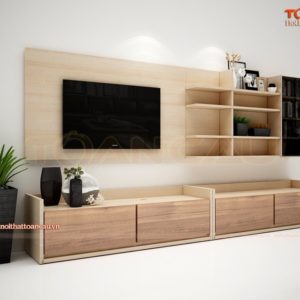 Với kiểu dáng màu sắc nhẹ nhàng, rất phù hợp với không gian căn nhà chật chội trở nên có điểm nhấn hơn. Ngoài ra tủ tivi gỗ ép công nghiệp còn có ngăn tủ để người dùng có thể dễ dàng cất những món đồ vào ngăn lưu trữ một cách gọn gàng hơn.